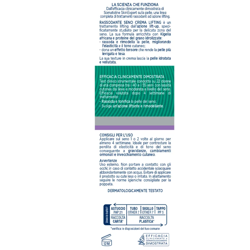 Il prodotto è consigliato per tutte le donne che desiderano prevenire oppure attenuare il naturale processo di rilassamento cutaneo che riguarda il seno con un trattamento dall’azione anti-age specifica.