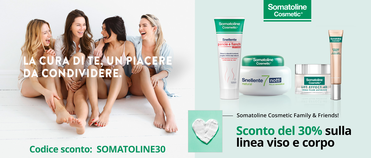 In questa sezione troverai i prodotti Somatoline Cosmetic viso e corpo in super promozione con uno sconto del 30%. Ti basta inserire nel carrello il codice sconto: SOMATOLINE30. Dai un'occhiata!