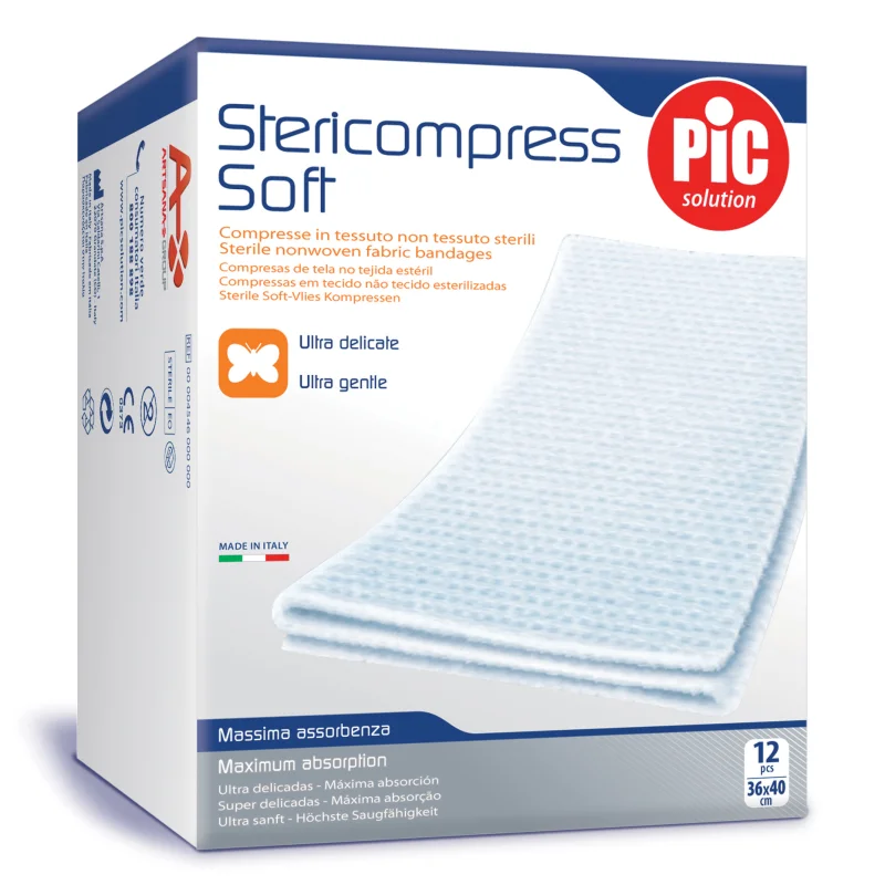compresse dalla speciale composizione in tessuto non tessuto (viscosa e poliestere), ipoallergeniche e particolarmente delicate a contatto con l’epidermide.