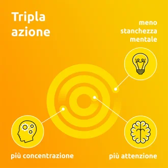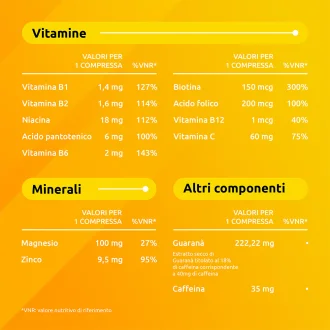 Integratore alimentare che, grazie alla presenza di Caffeina e Guaranà, ha unatriplice azione: la Caffeina aiuta ad aumentare l’attenzione e a migliorare laconcentrazione mentre il Guaranà agisce come tonico contro la stanchezza mentale.Completano la formula le vitamine del gruppo B, la Vitamina C, il Magnesio e lo Zincoutili nei casi di aumentato fabbisogno fisiologico o di ridotto apporto con la normaledieta. In particolare, la Vitamina B2, la Vitamina B6, la Vitamina B12, la Vitamina C, laNiacina e il Magnesio contribuiscono al normale funzionamento del sistema nervoso e aridurre stanchezza e affaticamento.