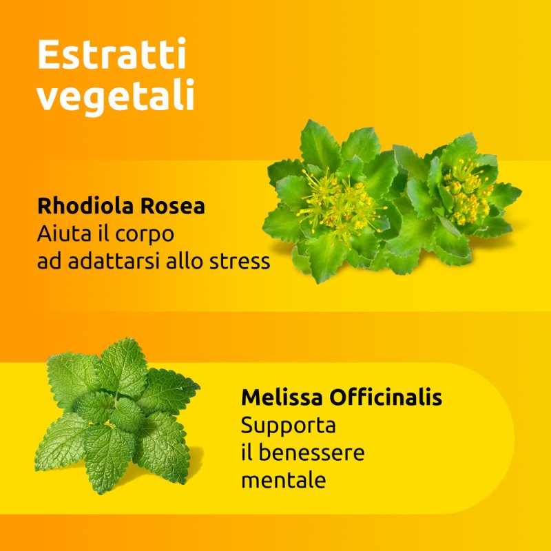 Una bustina contiene: Vitamina B6 4.2 mg; Vitamina B12 7.5 mcg; Acido Pantotenico (Vitamina B5) 6 mg; Acido Folico 300 mcg; Magnesio 250 mg; estratto di Rhodiola Rosea 170 mg titolata al 2% in rosavine, corrispondenti a 3.4 mg di rosavine; estratto di foglie di Melissa 160 mg.