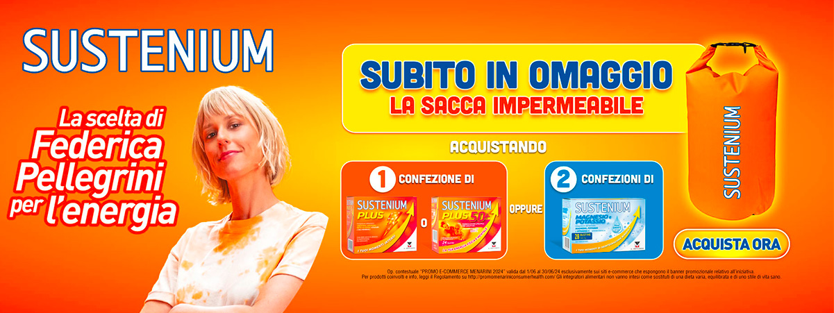 Dai energia alla tua energia: da oggi, all'acquisto di 1 confezione di Sustenium Plus o di Sustenium Plus 50+, oppure all'acquisto di 2 confezioni di Sustenium Magnesio e Potassio, ricevi subito in omaggio una comodissima sacca impermeabile!